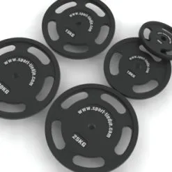 - Incluye pack de 75 kg de discos de pesas de hierro fundido 3G con orificios de agarre de Fitshop, en las siguientes cantidades: