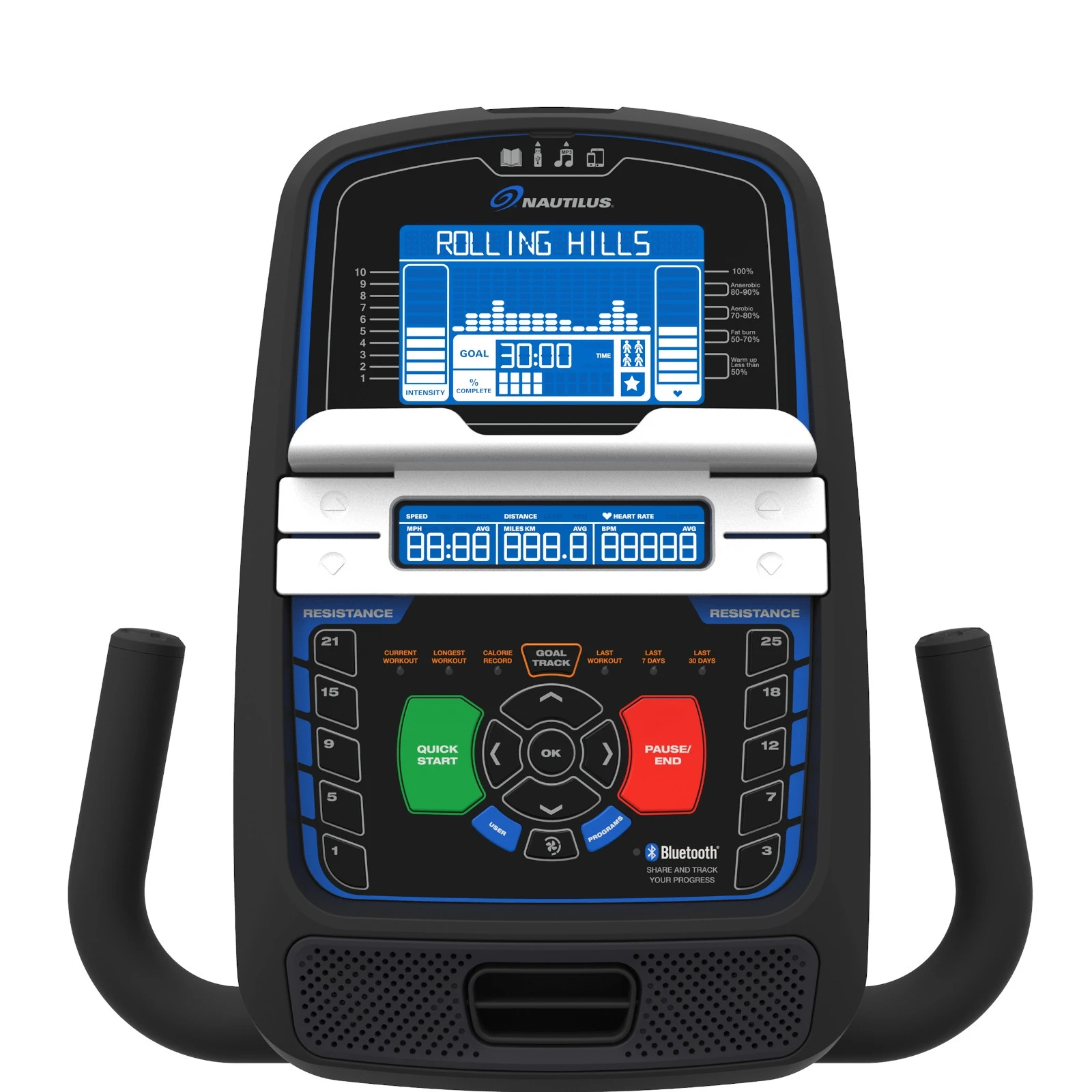 El ordenador de entrenamiento con retroiluminación azul te mantiene informado sobre los datos de entrenamiento relevantes, como el pulso, el tiempo o la distancia actualizada. Además, los datos de entrenamiento se pueden sincronizar con la aplicación Nautilus Trainer™ 2 mediante una interfaz Bluetooth Smart. Con el fin de evaluar los resultados del entrenamiento, los datos se pueden transferir a la plataforma de entrenamiento Nautilus Connect mediante una memoria USB en el ordenador.