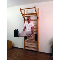 Bandas elásticas, de esta forma la Espaldera se convertirá en una estación de entrenamiento compacta con una gran variedad de posibilidades para ejercitarse. Con la Espaldera NOHrD Fresno se amplia mucho más dicha posibilidad. La Espaldera NOHrD Fresno posee una extensión abatible en su parte superior, donde por ejemplo podrá realizar dominadas.