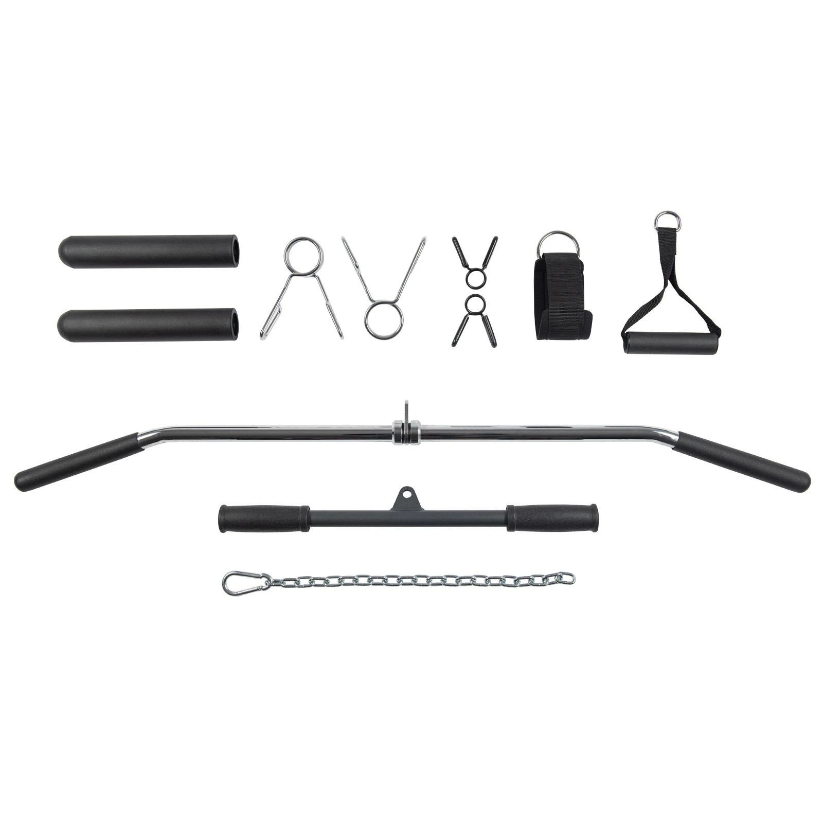 - Incluye: barra de tracci贸n ancha, agarre de remo, agarre simple, dragonera para pies, complemento para pesas de 50 mm, dos cierres de resorte cada uno (30 mm y 50 mm), cadena de prolongaci贸n y mosquetones