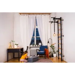 La altura de la espaldera asciende a 240 cm y permite instalarla en casi cualquier habitación con una altura mínima de 250 cm. Dado que la espaldera solo mide 67 cm de ancho, se puede integrar de manera óptima en cualquier espacio. Gracias a su aspecto elegante, la espaldera se puede utilizar tanto como mueble de diseño como para un entrenamiento eficaz.