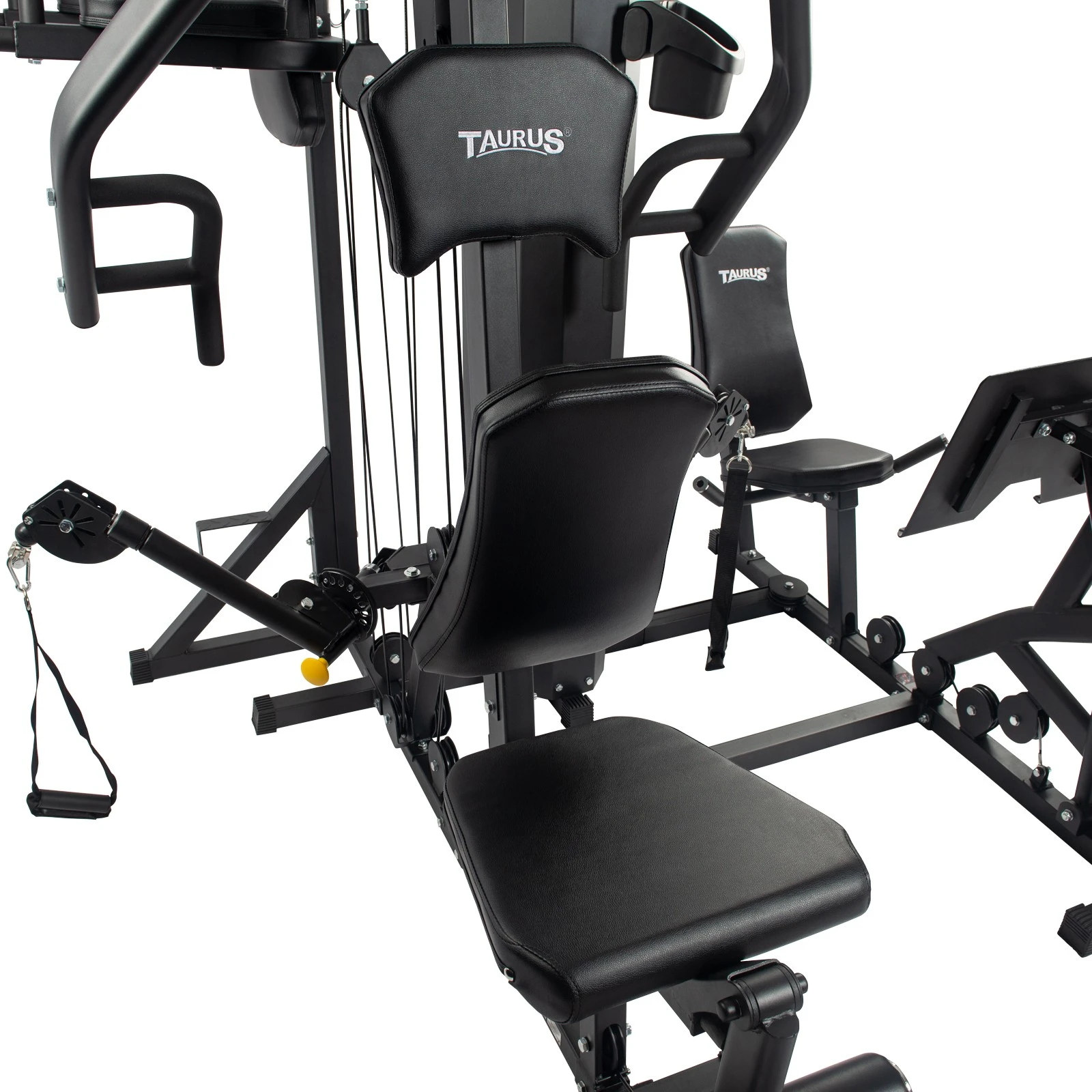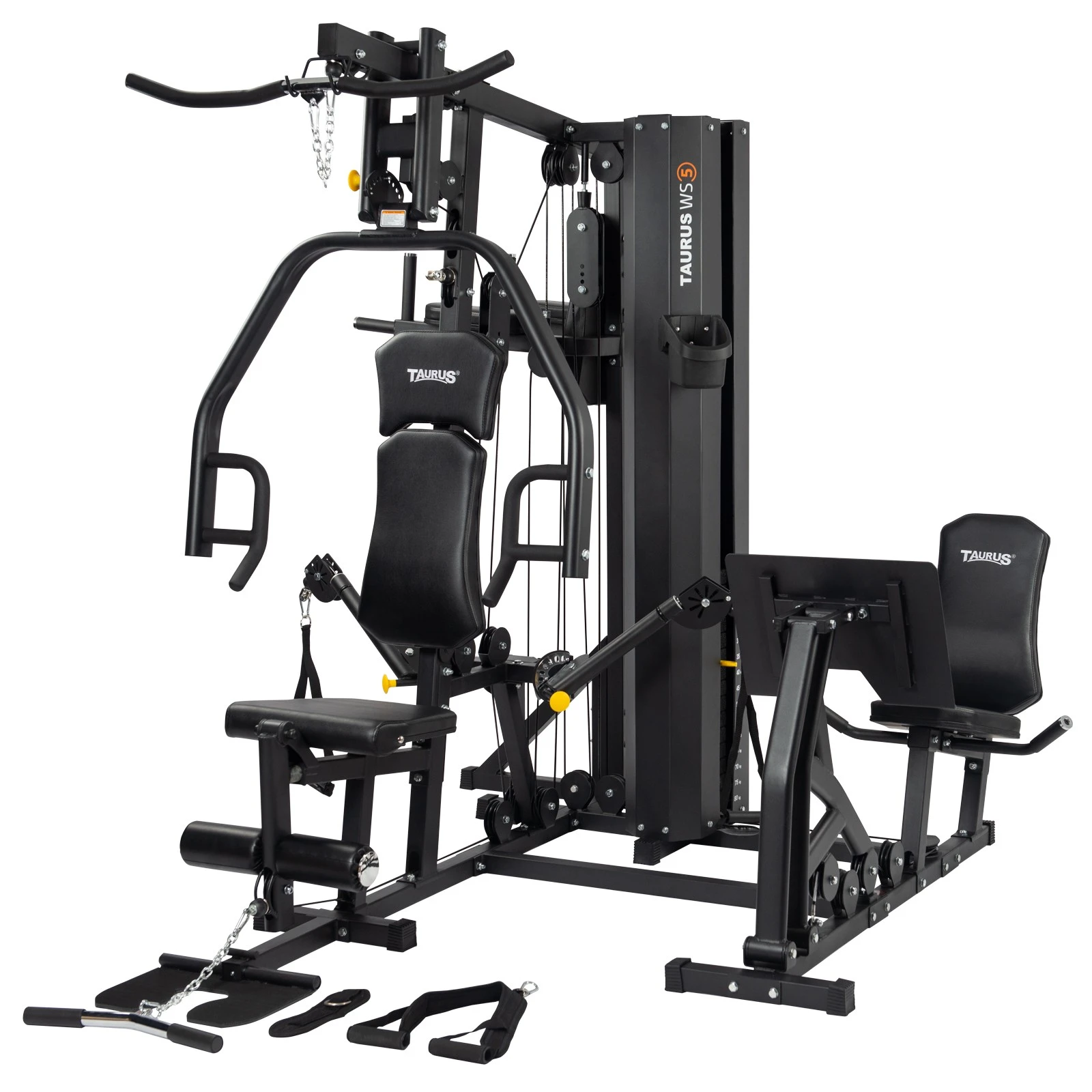 La Multiestaci贸n Taurus WS5 ofrece muchos ejercicios para todo el cuerpo. La Multiestaci贸n Taurus WS5 viene adicionalmente con una estaci贸n de dips/fondos y un press de piernas, junto con las funciones habituales de una estaci贸n de fuerza. En el lateral de este Home Gym se halla adem谩s una polea libre.
