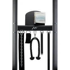 La HFT de Bodycrarft tiene una fabricación de primera clase. Los cables son extremadamente resistentes y pasan por los grandes poleas de inversión, lo que asegura que el movimiento sea siempre uniforme. Los rodamientos de bolas están sellados, de manera que no puedan entrenar ni la humedad ni el polvo. De esta forma se garantiza un movimiento circular. La HFT de Bodycraft incluye unos completos accesorios, entre los que se encuentran diferentes agarres, así como cadenas, con las que podrá añadir peso adicional en caso de que los ejercicios en la barra de dominales le resulten demasiado fáciles.
