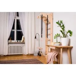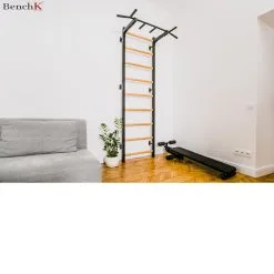 Los materiales empleados en la espaldera BenchK son de gran calidad y brindan una est茅tica elegante y atemporal. Este set de espaldera se integra perfectamente en el sal贸n y es, adem谩s, un aparato de entrenamiento y juego especialmente compacto.