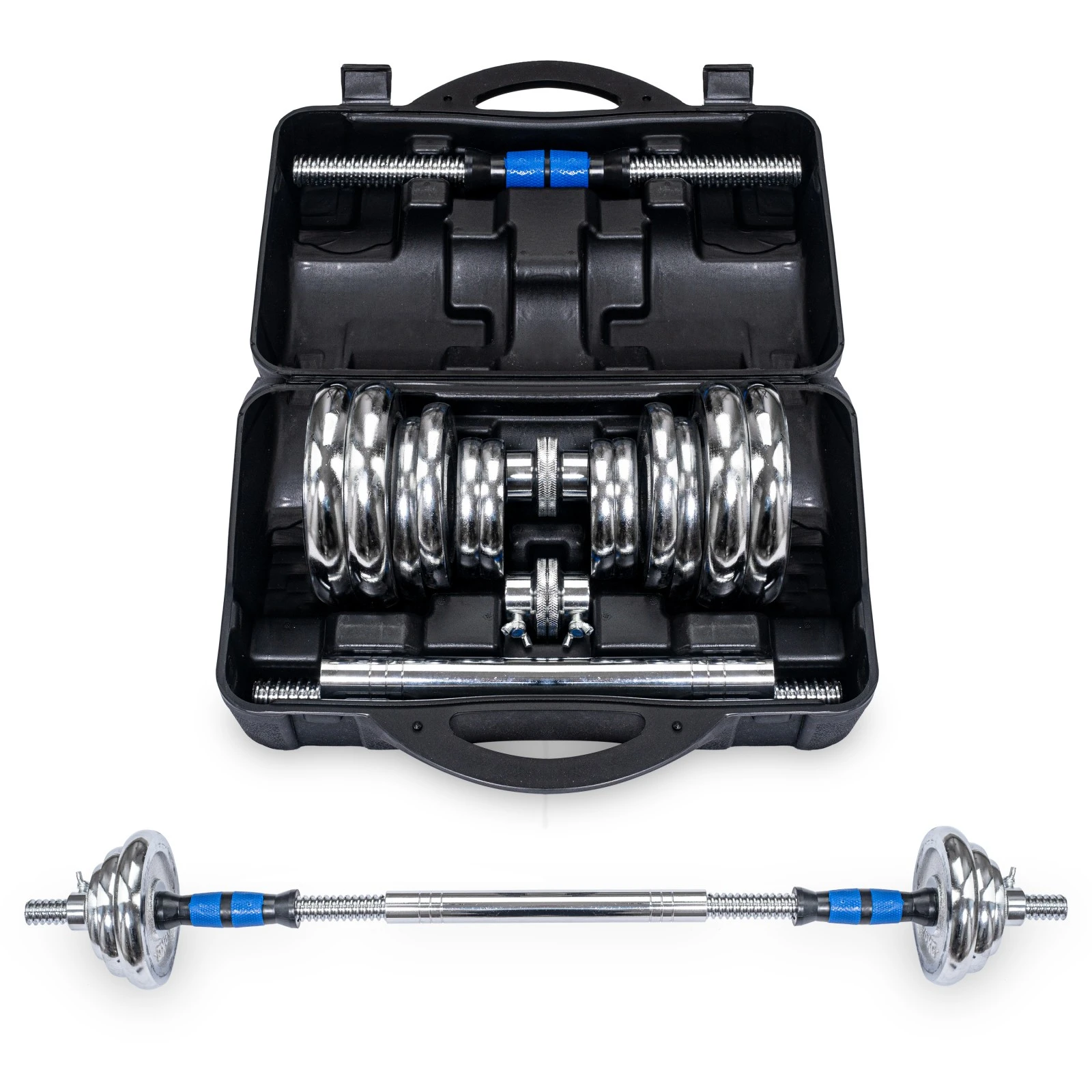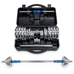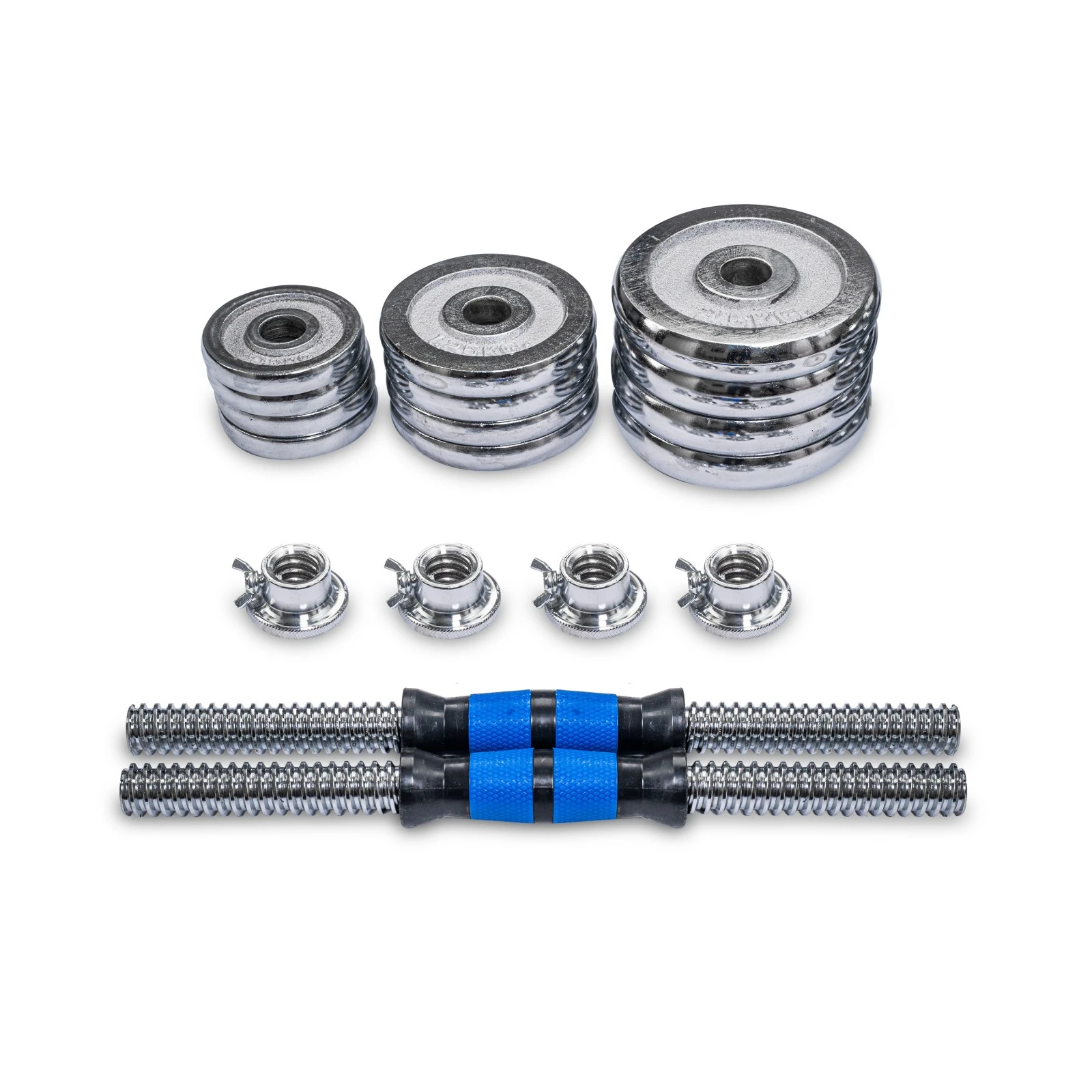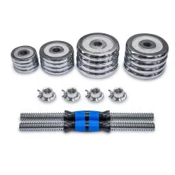 Con el set de pesas Climaqx te harás con el perfecto sistema de entrenamiento 2 en 1 para casa. Lo mejor de este set: con el conector que incluye el set podrás transformar las dos mancuernas en una barra larga en cuestión de segundos, aumentando así notablemente el espectro de ejercicios. Con el set de pesas Climaqx tendrás la opción de entrenar de forma intensiva cualquier grupo muscular de tu cuerpo y planificar el entrenamiento según tus propias necesidades personales. Tanto el set de pesas de 20 Kg como el de 30 Kg pueden cargarse de forma individual con distintos discos de peso (0,5 Kg, 1,25 Kg y 2,5 Kg), de modo que podrás ajustar el peso de manera rápida y sencilla según las necesidades de cada momento. Todos los discos de peso vienen una perforación de 28 mm. Los discos están fabricados en hierro fundido muy robusto y aguantan así cualquier entrenamiento. Además los agarres de las barras de mancuernas cuentan con un material antideslizante y ofrecen el agarre óptimo durante el entrenamiento. ¡Completa hoy mismo tu propio gimnasio llevándote a casa este set de pesas, ya sea de 20 Kg o de 30 Kg!