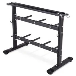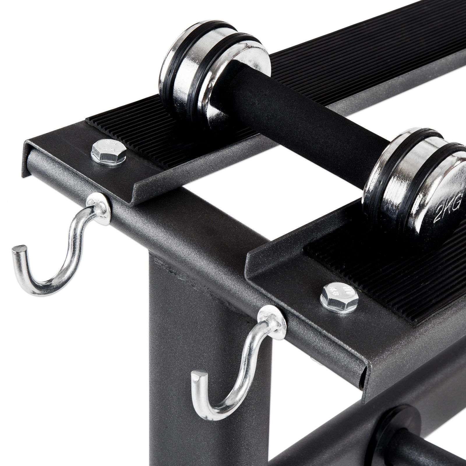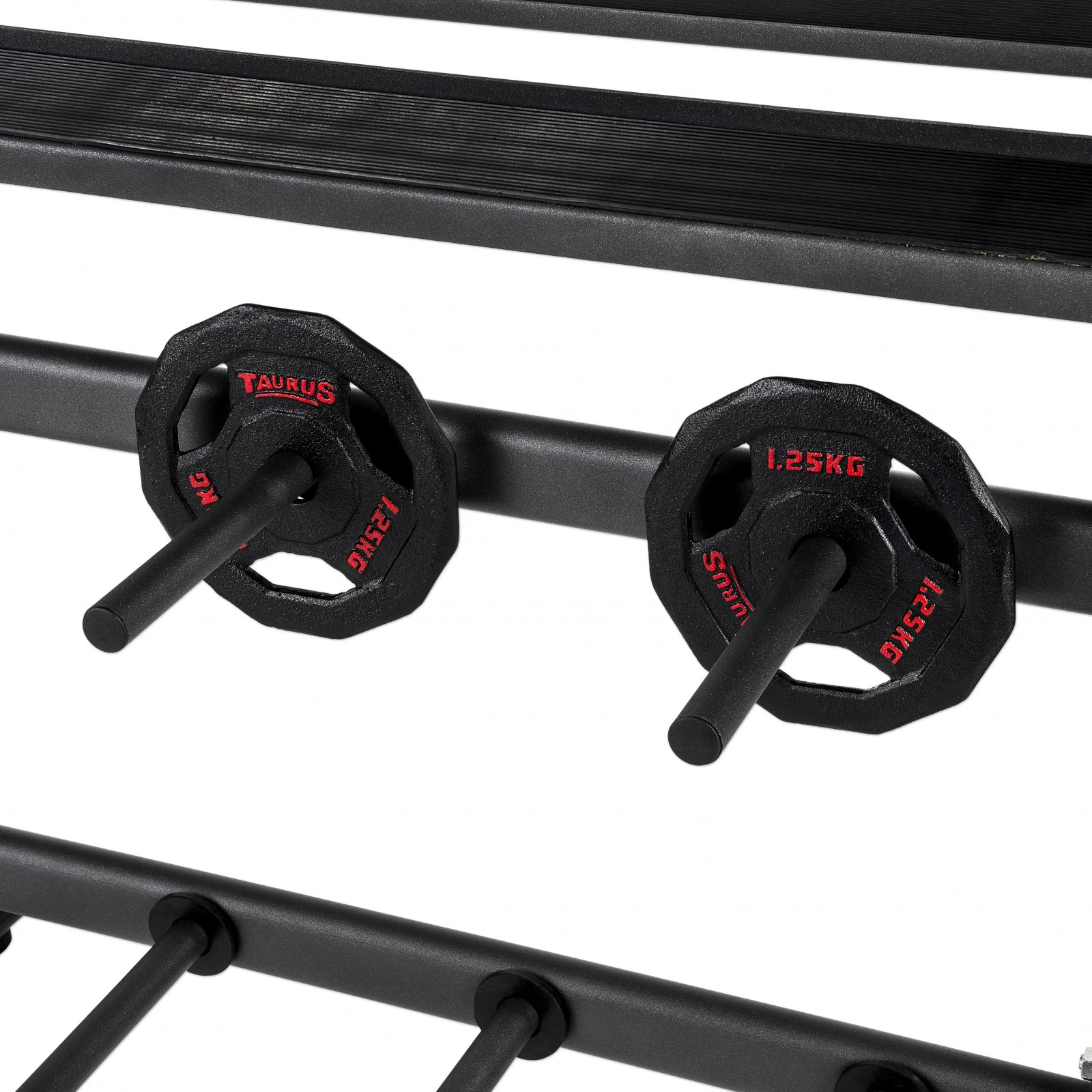 El Soporte para mancuernas y discos de Taurus es un punto de almacenamiento versátil y robusto para un gran número de equipamientos de entrenamiento. En este soporte para mancuernas combinado, puede almacenar al mismo tiempo mancuernas, mancuernas compactas, discos de 30 mm, barras de pesas y accesorios. La disposición de los puntos de almacenamiento ofrece mucho lugar para equipamiento de entrenamiento ocupando un espacio relativamente pequeño.